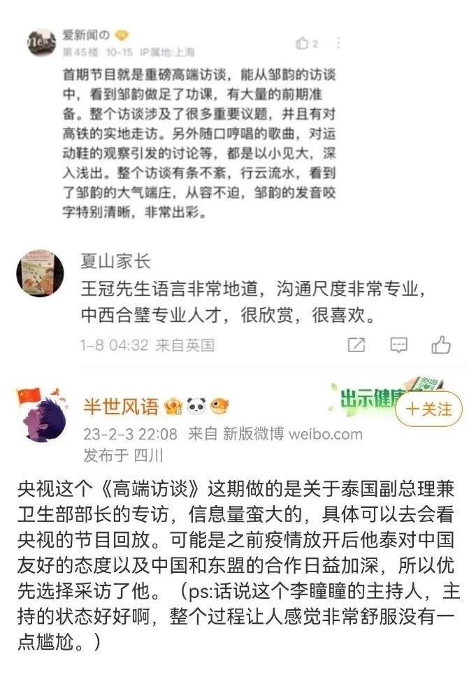 專(zhuān)訪(fǎng)泰國(guó)副總理阿努廷時(shí),主持人李曈曈提到,他去機(jī)場(chǎng)迎接中國(guó)游客的新聞,在中國(guó)社交媒體有4.9億閱讀量。阿努廷感動(dòng)地說(shuō),他當(dāng)時(shí)說(shuō)的都是肺腑之言,沒(méi)想到會(huì)有這么多人看到這條新聞。