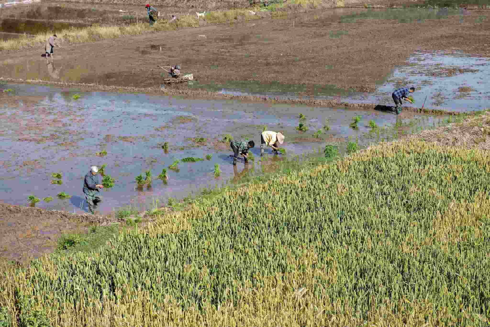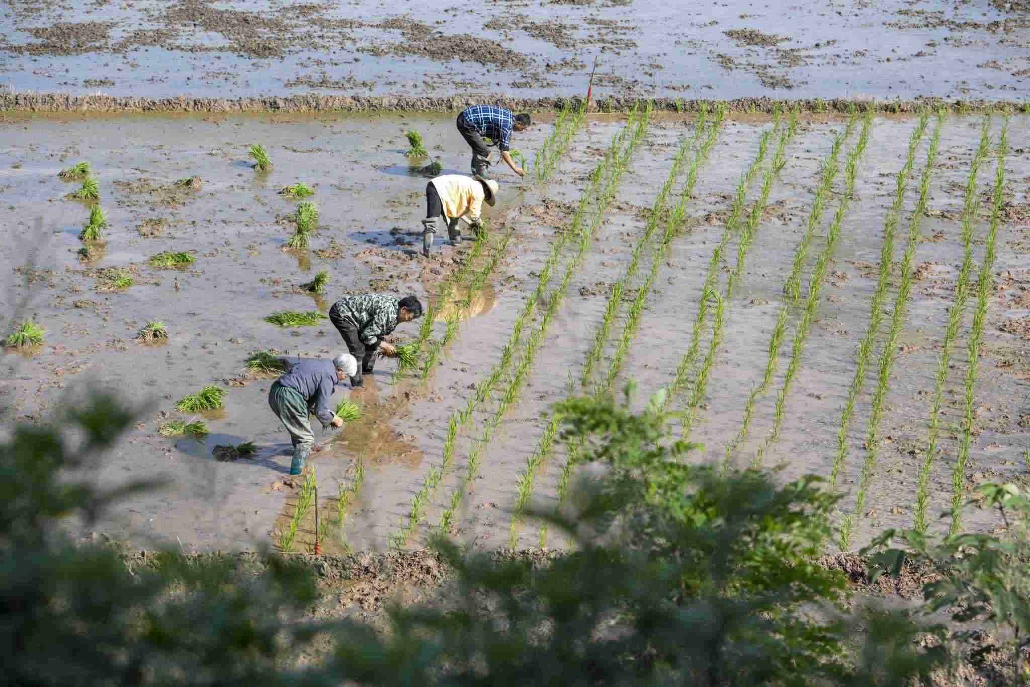 2023年4月30日,四川閬中,暮春時(shí)節(jié),村民在囤水田栽插早稻,處處可見搶抓農(nóng)時(shí)的忙碌身影。視覺中國