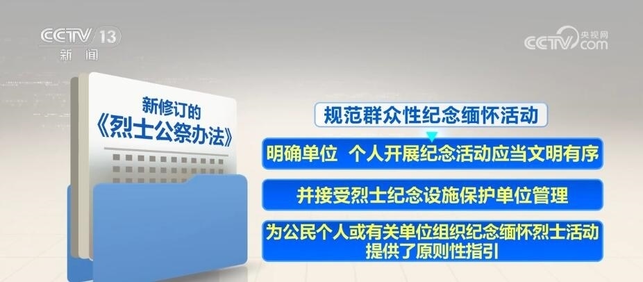 新修訂的《烈士公祭辦法》自5月1日起施行。其中,強調發(fā)揮公祭活動對青少年的教育作用,要求各級各類學校組織學生以適當方式參加烈士公祭,加強愛國主義、集體主義、社會主義教育。規(guī)范群眾性紀念緬懷活動,明確單位、個人開展紀念活動應當文明有序,并接受烈士紀念設施保護單位管理,為公民個人或有關單位組織紀念緬懷烈士活動提供了原則性指引。