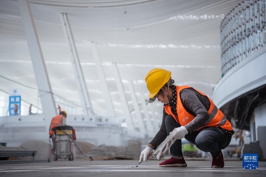 5月1日,在中建三局承建的武漢天河機場T2航站樓改造工程項目工地,工人在進行樓地面施工作業(yè)。