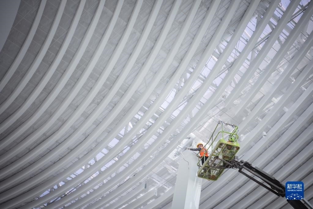 5月1日,在中建三局承建的武漢天河機場T2航站樓改造工程項目工地,工人在檢查吊頂內管線。