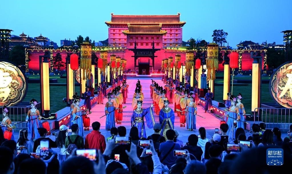 4月30日,游客在西安城墻景區(qū)觀看演出《夢(mèng)長(zhǎng)安——大唐迎賓盛禮》。