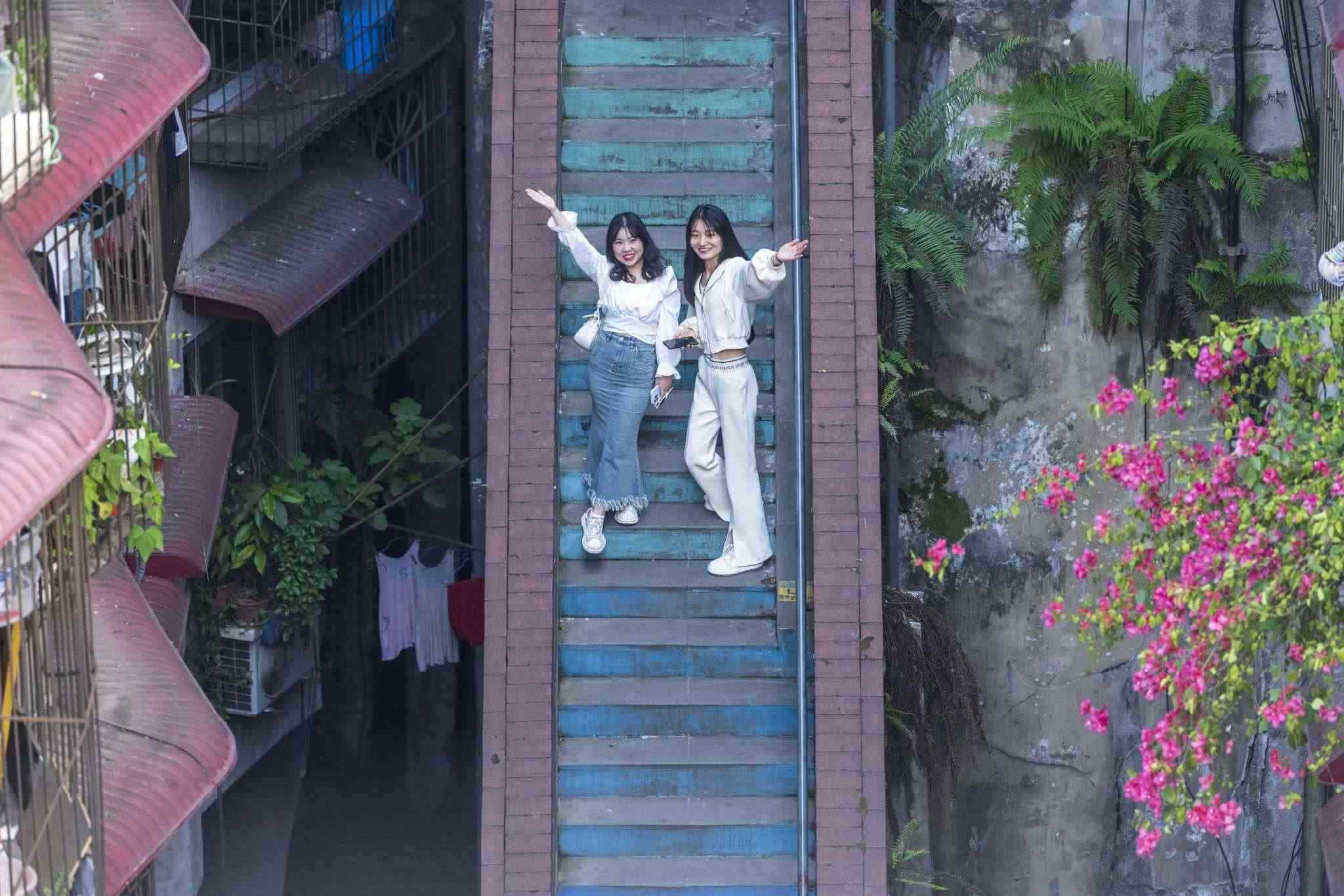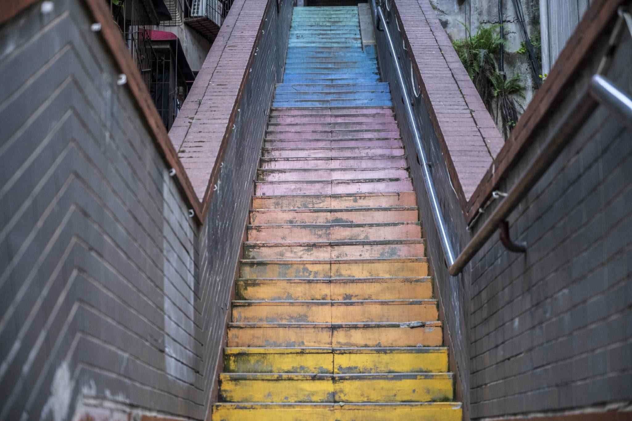 “彩虹樓梯”位于重慶渝中區(qū)枇杷山正街的居民樓間,高約20米,共有50多級(jí)階梯,極具山城特色。經(jīng)過(guò)多種顏色涂鴉后,吸引不少市民和攝影愛好者“打卡”。視覺中國(guó)