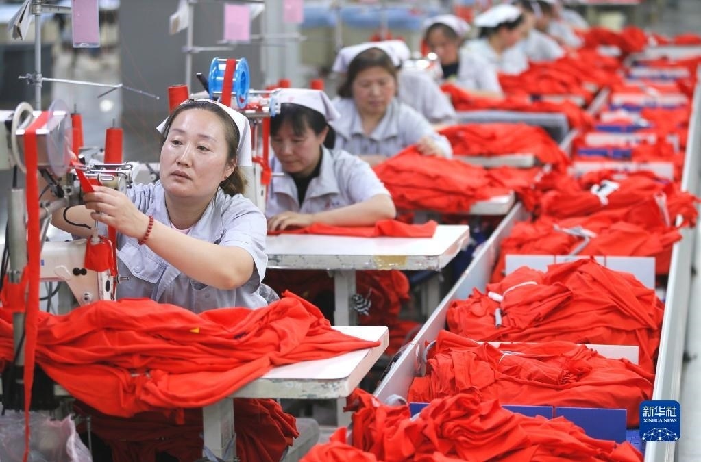 5月4日,在山東省青島市即墨區(qū)一家服裝企業(yè),工人生產(chǎn)出口到海外市場(chǎng)的服裝。