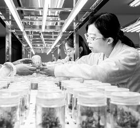 3月29日,在內(nèi)蒙古林業(yè)科學(xué)研究院承擔(dān)的“沙地生物資源保護(hù)與培育國(guó)家林業(yè)和草原局重點(diǎn)實(shí)驗(yàn)室”,科研人員在觀察黑果枸杞組培苗的培養(yǎng)狀態(tài)。丁根厚攝/光明圖片