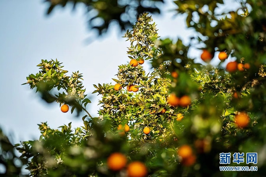 一簇簇雪白的橘花和黃澄澄的柑橘相映成趣、渾然一體。新華網(wǎng)發(fā)(余鴻 攝)