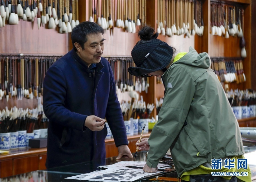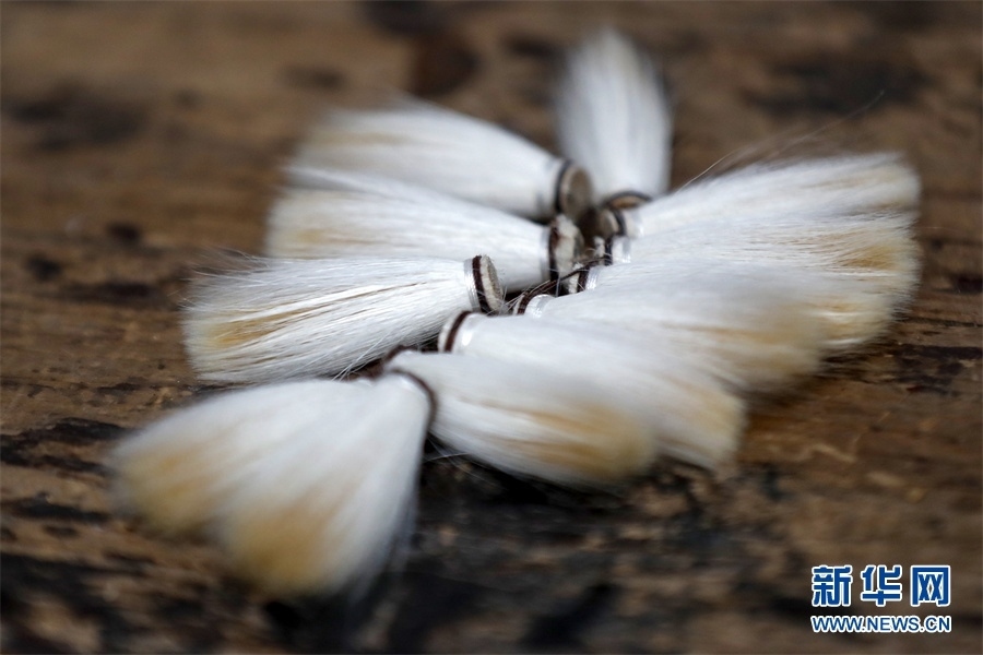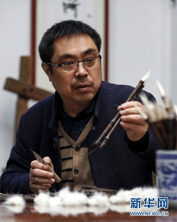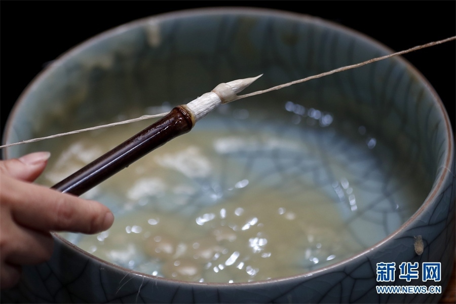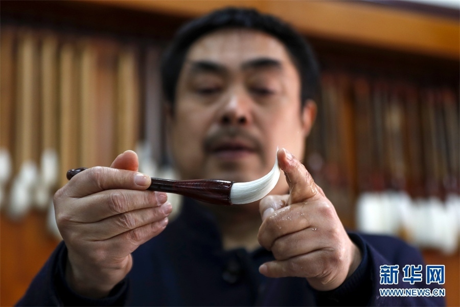 一支好的徽筆,不僅要保留傳統(tǒng)工藝,且要在原基礎(chǔ)上不斷創(chuàng)新、改良。楊文尤其重視書畫家對筆的使用反饋:“因?yàn)樗麄儗τ霉P最挑剔,而且現(xiàn)代書畫家創(chuàng)作方式和作品不斷創(chuàng)新,對毛筆也有新的要求,他們提出的要求我總是盡力去滿足,也使得制筆技藝進(jìn)一步得到了提高?!? 新華網(wǎng)發(fā)(施亞磊 攝)
