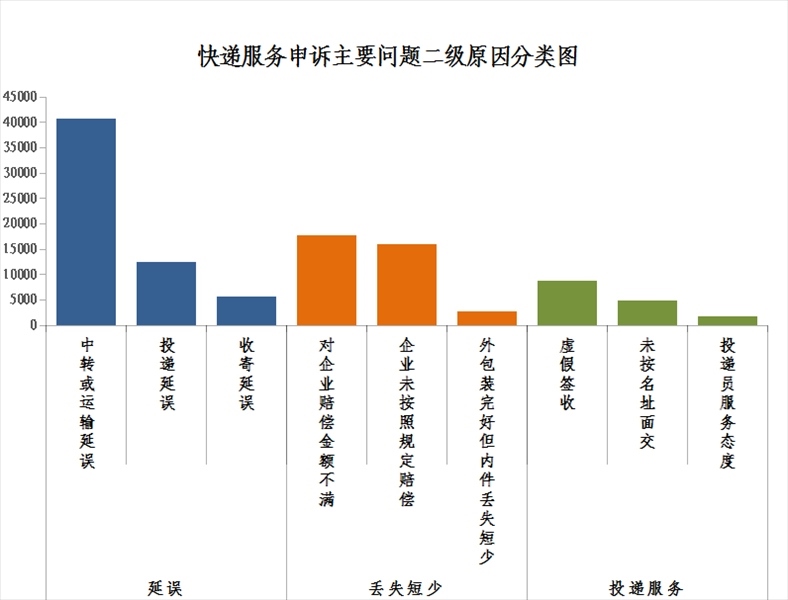 2.快遞服務(wù)申訴主要問題二級(jí)原因情況。快件延誤申訴中主要占比較多的是中轉(zhuǎn)或運(yùn)輸延誤,快件丟失短少申訴中主要占比較多的是對企業(yè)賠償金額不滿,投遞服務(wù)申訴中主要占比較多的是虛假簽收。