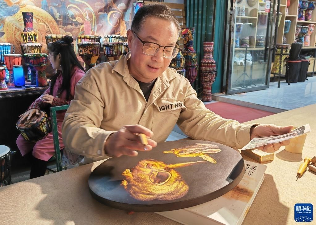 5月10日,工藝美術(shù)師申洪杰在敦煌夜市進(jìn)行敦煌木刻畫創(chuàng)作展示(手機照片)。