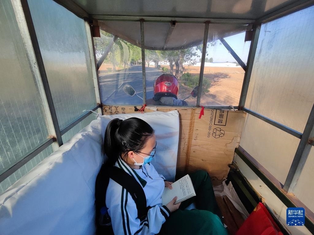 清晨,張連琴騎著電動(dòng)三輪車?yán)畠豪铌總トド蠈W(xué),女兒在車棚內(nèi)背誦詩(shī)詞(5月8日手機(jī)拍攝)。   新華社記者 姚劍鋒 攝
