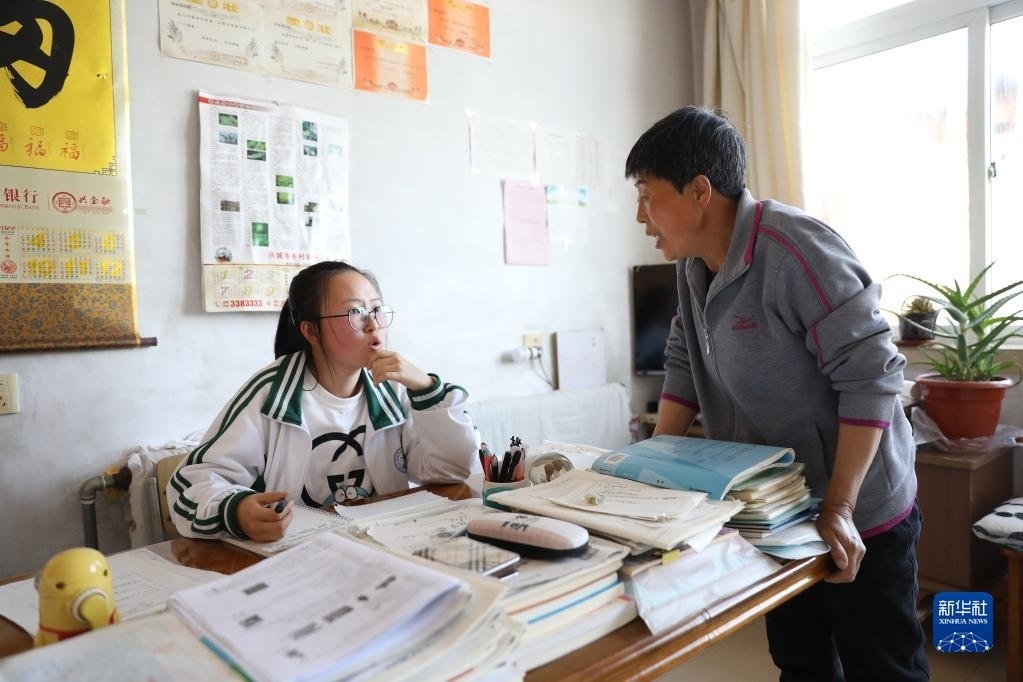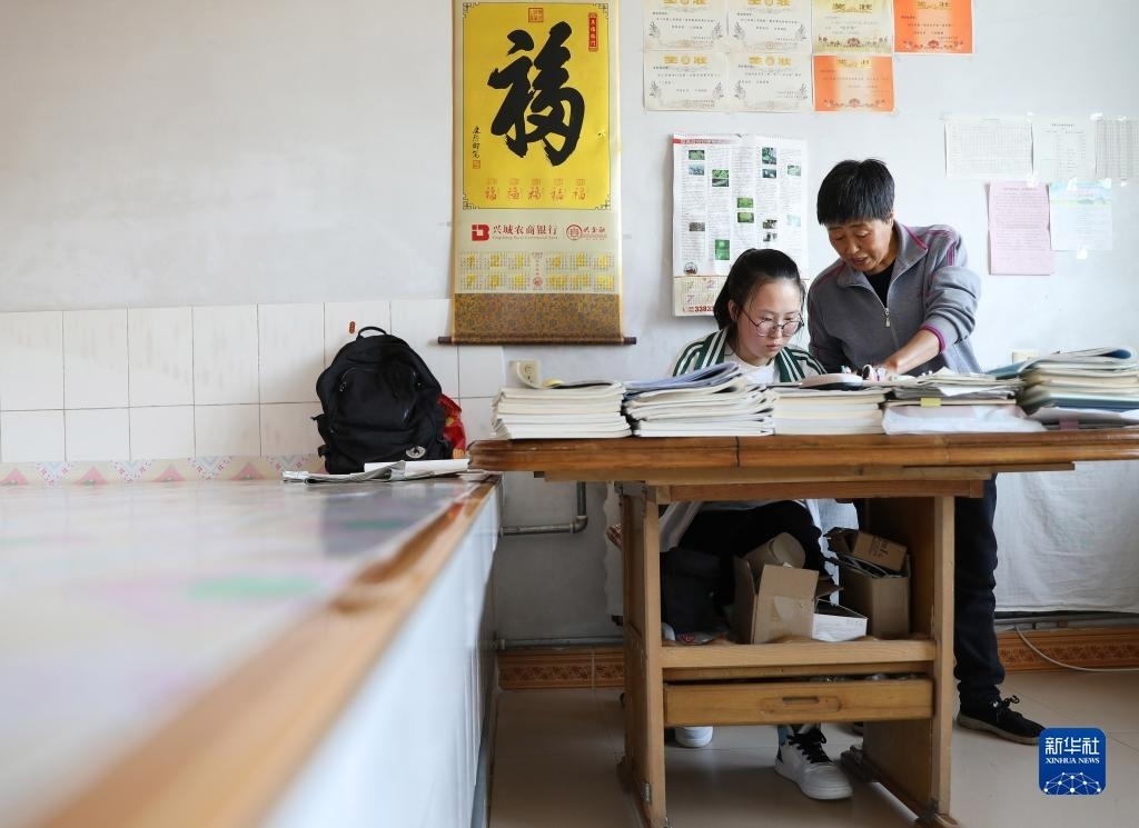 張連琴(右)和女兒在交流學(xué)校布置的作文(5月7日攝)。   新華社記者 姚劍鋒 攝