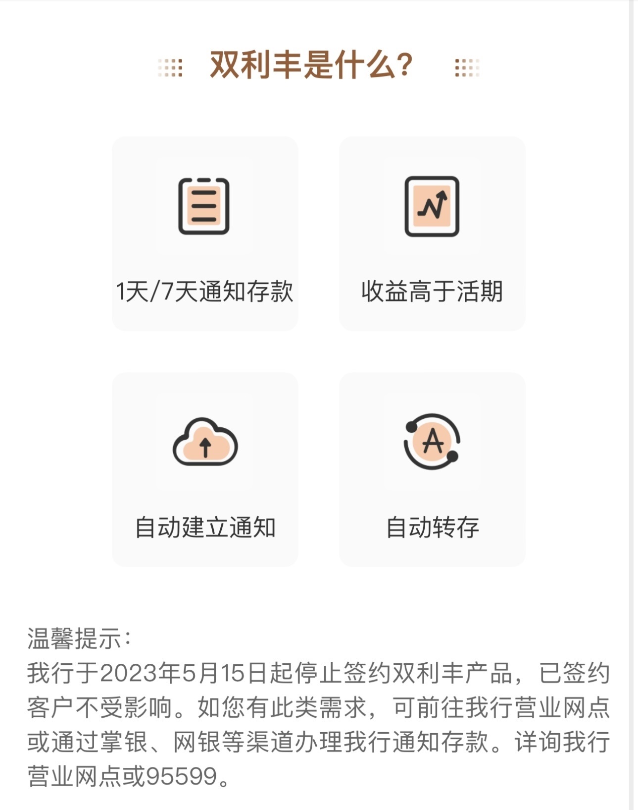 農(nóng)業(yè)銀行App顯示,該行存款專區(qū)中的智能通知存款產(chǎn)品“雙利豐”于5月15日起停止簽約,已簽約客戶不受影響。農(nóng)行表示,如有此類需求,可前往營(yíng)業(yè)網(wǎng)點(diǎn)或通過(guò)掌銀、網(wǎng)銀等渠道辦理通知存款。