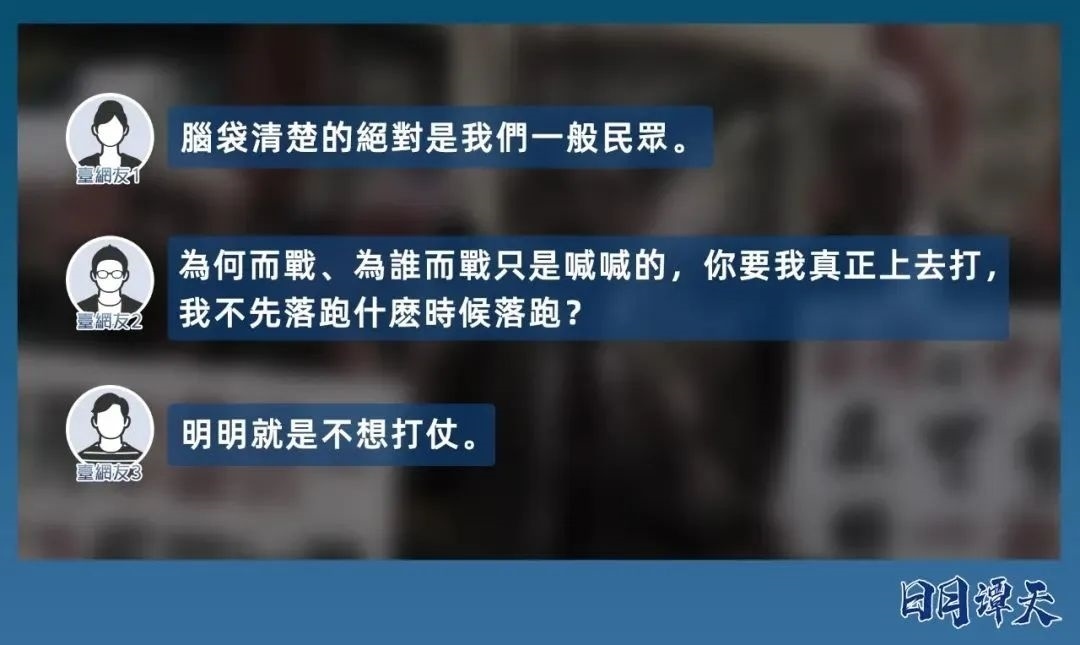 島內(nèi)專(zhuān)家給譚主分析了臺(tái)灣青年不愿再賣(mài)命背后的深層邏輯。越來(lái)越多臺(tái)青意識(shí)到,“臺(tái)獨(dú)”意味著戰(zhàn)爭(zhēng),為“臺(tái)獨(dú)”上戰(zhàn)場(chǎng),打的是一場(chǎng)非正義的分裂國(guó)土之戰(zhàn),要背負(fù)歷史罵名,臺(tái)灣年輕人憑什么要為此賭上性命?與其被民進(jìn)黨當(dāng)局裹挾著為“臺(tái)獨(dú)”送死,不如盡早“跳車(chē)”,遠(yuǎn)離臺(tái)軍。