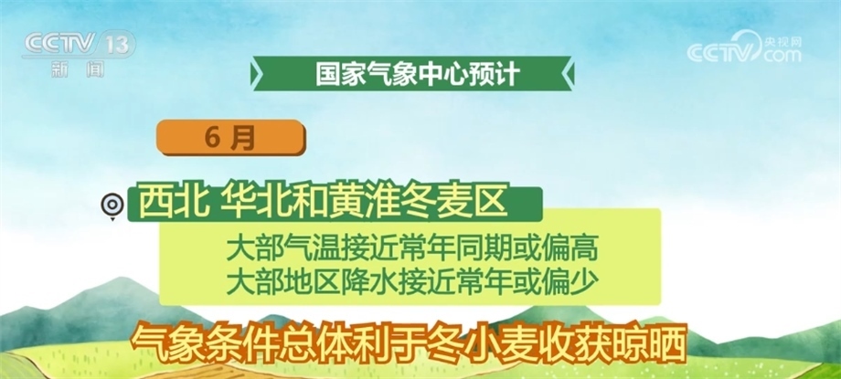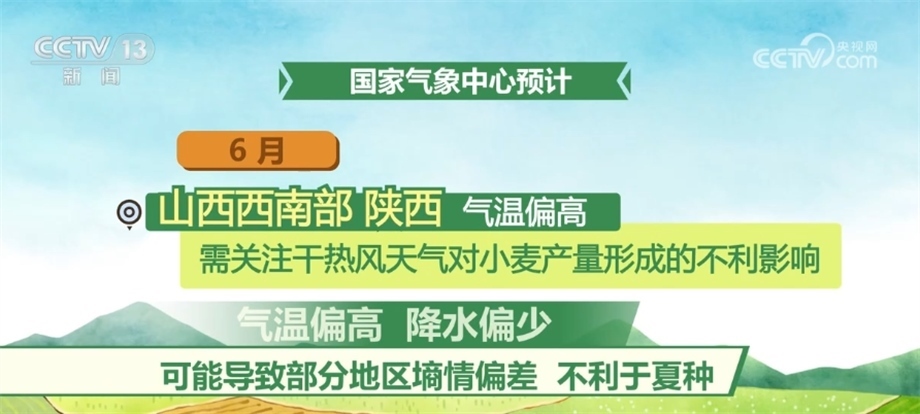 6月,西北、華北和黃淮冬麥區(qū)大部氣溫接近常年同期或偏高,大部地區(qū)降水接近常年或偏少,氣象條件總體利于冬小麥?zhǔn)斋@晾曬;但山西西南部、陜西氣溫偏高,需關(guān)注干熱風(fēng)天氣對小麥產(chǎn)量形成的不利影響,此外,氣溫偏高、降水偏少可能導(dǎo)致部分地區(qū)墑情偏差,不利于夏種。
