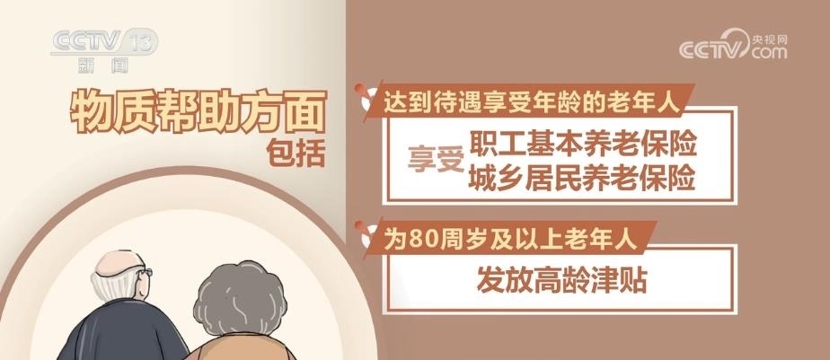 物質(zhì)幫助方面包括:達(dá)到待遇享受年齡的老年人享受職工基本養(yǎng)老保險(xiǎn)和城鄉(xiāng)居民養(yǎng)老保險(xiǎn);為80周歲及以上老年人發(fā)放高齡津貼;為經(jīng)濟(jì)困難的老年人提供養(yǎng)老服務(wù)補(bǔ)貼;為經(jīng)認(rèn)定生活不能自理的老年人提供護(hù)理補(bǔ)貼;為納入最低生活保障范圍的老年人提供最低生活保障;經(jīng)認(rèn)定符合條件的殘疾老年人享受困難殘疾人生活補(bǔ)貼和重度殘疾人護(hù)理補(bǔ)貼;對(duì)生活無著的流浪、乞討老年人依照有關(guān)規(guī)定給予救助。