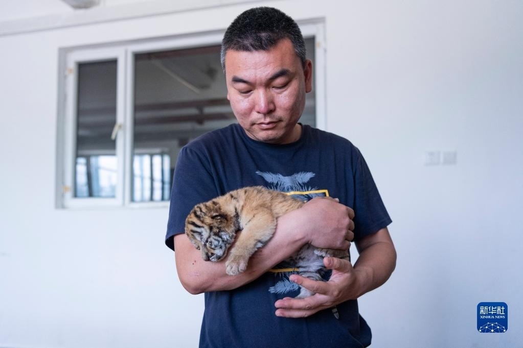 5月22日,在黑龍江東北虎林園的虎舍中,飼養(yǎng)員查看東北虎幼崽生長(zhǎng)狀況。   新華社記者 謝劍飛 攝