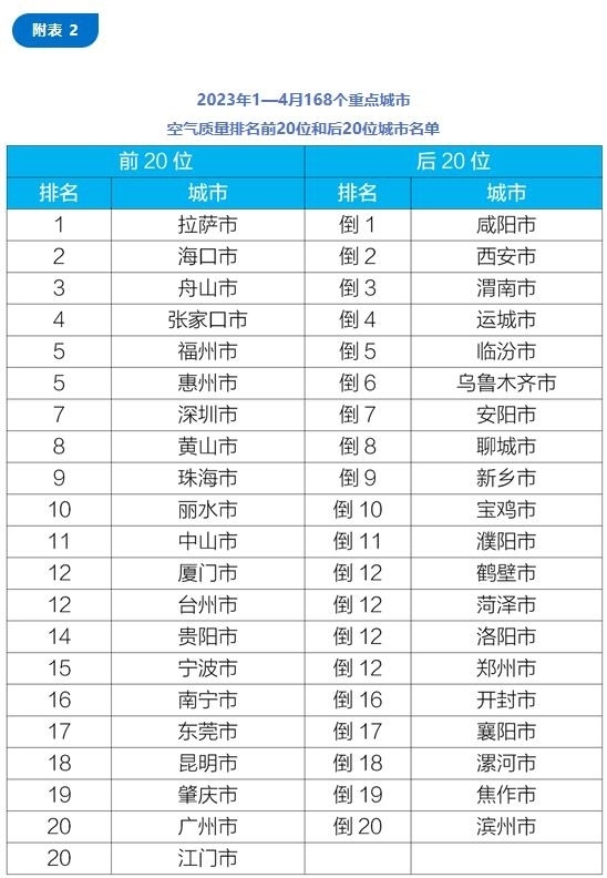 1—4月,168個(gè)重點(diǎn)城市中,拉薩、海口和舟山等城市空氣質(zhì)量相對(duì)較好(從第1名至并列第20名);咸陽、西安和渭南等城市空氣質(zhì)量相對(duì)較差(從倒數(shù)第1名至倒數(shù)第20名)。