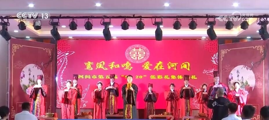 在江西貴溪、山東巨野等地,五月份組織了多場主題為“不要彩禮要幸?!钡募w婚禮,倡導(dǎo)新人們選擇簡約的婚禮儀式。在河北省河間市的集體婚禮現(xiàn)場,紅毯艷艷、絲竹裊裊,新人們身著傳統(tǒng)禮服,在證婚人、主婚人的見證下,按照周制漢婚的傳統(tǒng)儀式開啟他們愛的旅程。