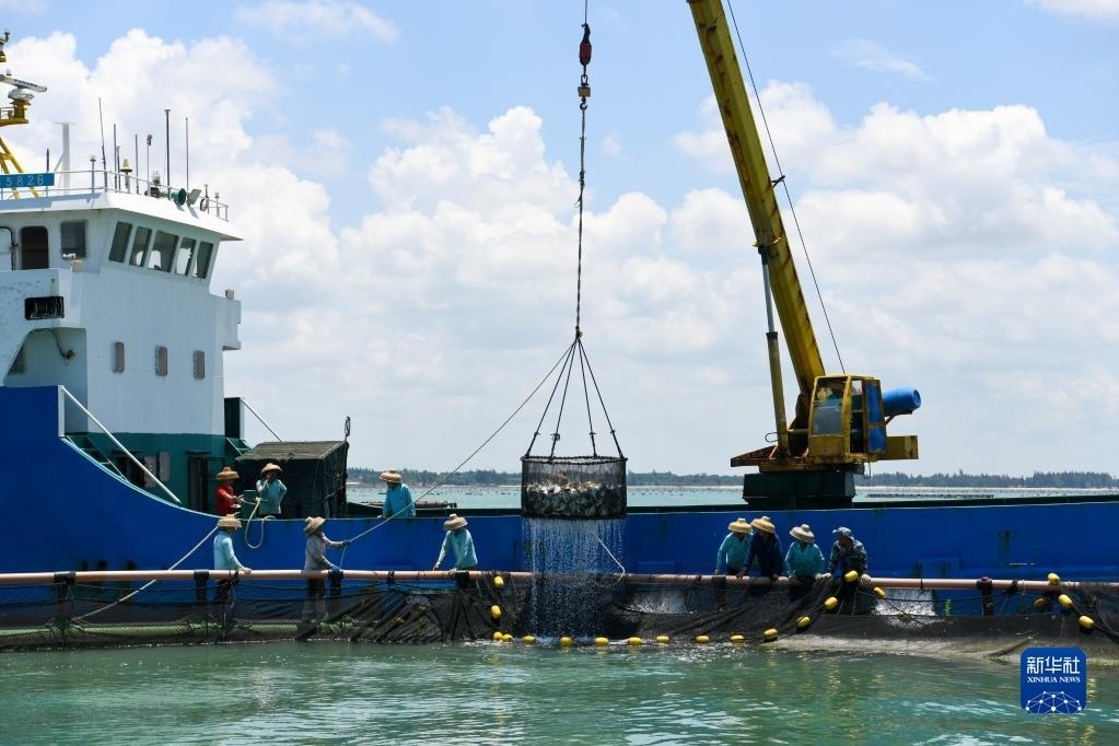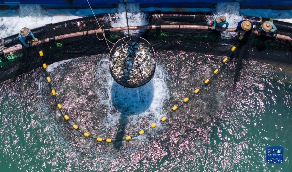 廣東省湛江市是全國最大的金鯧魚養(yǎng)殖基地之一,被譽為“中國金鯧魚之都”。在深藍色海面上,整齊分布著一串串100米左右周長的深海網(wǎng)箱,孕育著被譽為“黃金魚”的金鯧魚,年產(chǎn)量約10萬噸,約占全國產(chǎn)量三到四成,除了供應(yīng)中國市場,還出口到美國、印度、馬來西亞等國家和地區(qū)。隨著近年金鯧魚深海養(yǎng)殖規(guī)模化、集群化、市場化步伐加快,小小“黃金魚”每年可創(chuàng)造百億元產(chǎn)值。   新華社記者 盧漢欣 攝