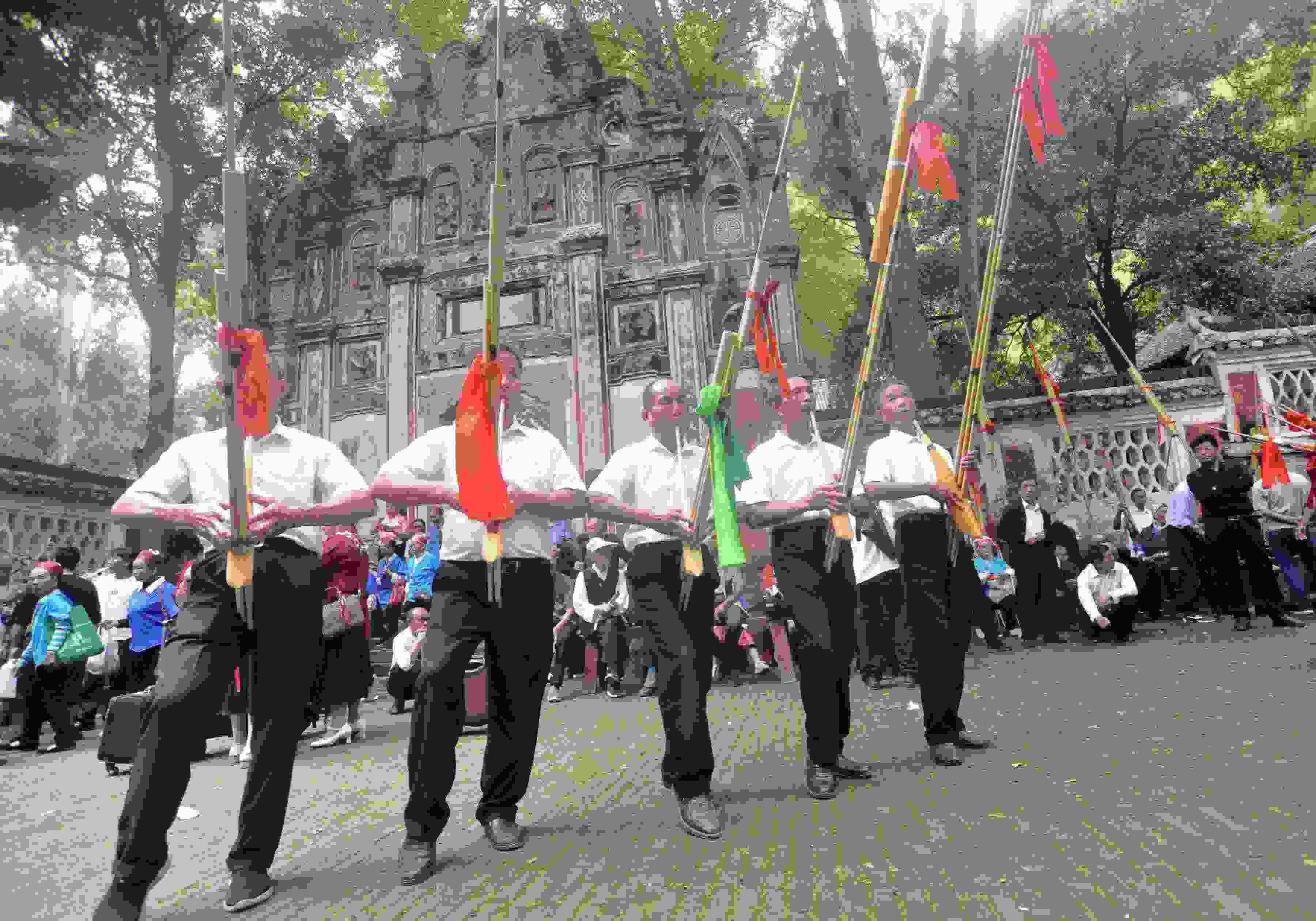 2023年5月26日,苗族同胞在貴州省黃平縣飛云崖景區(qū)給來賓敬攔門酒。當(dāng)日是農(nóng)歷四月初八,貴州省黔東南苗族侗族自治州黃平縣一年一度的苗族“四月八”系列活動拉開帷幕。苗族同胞身著盛裝開展吹蘆笙、踩鼓舞、對唱苗歌等系列民俗活動,并展示了泥哨、刺繡、銀飾及蠟染等非物質(zhì)文化遺產(chǎn)技藝,吸引了眾多游客。(寧堅 楊忠)