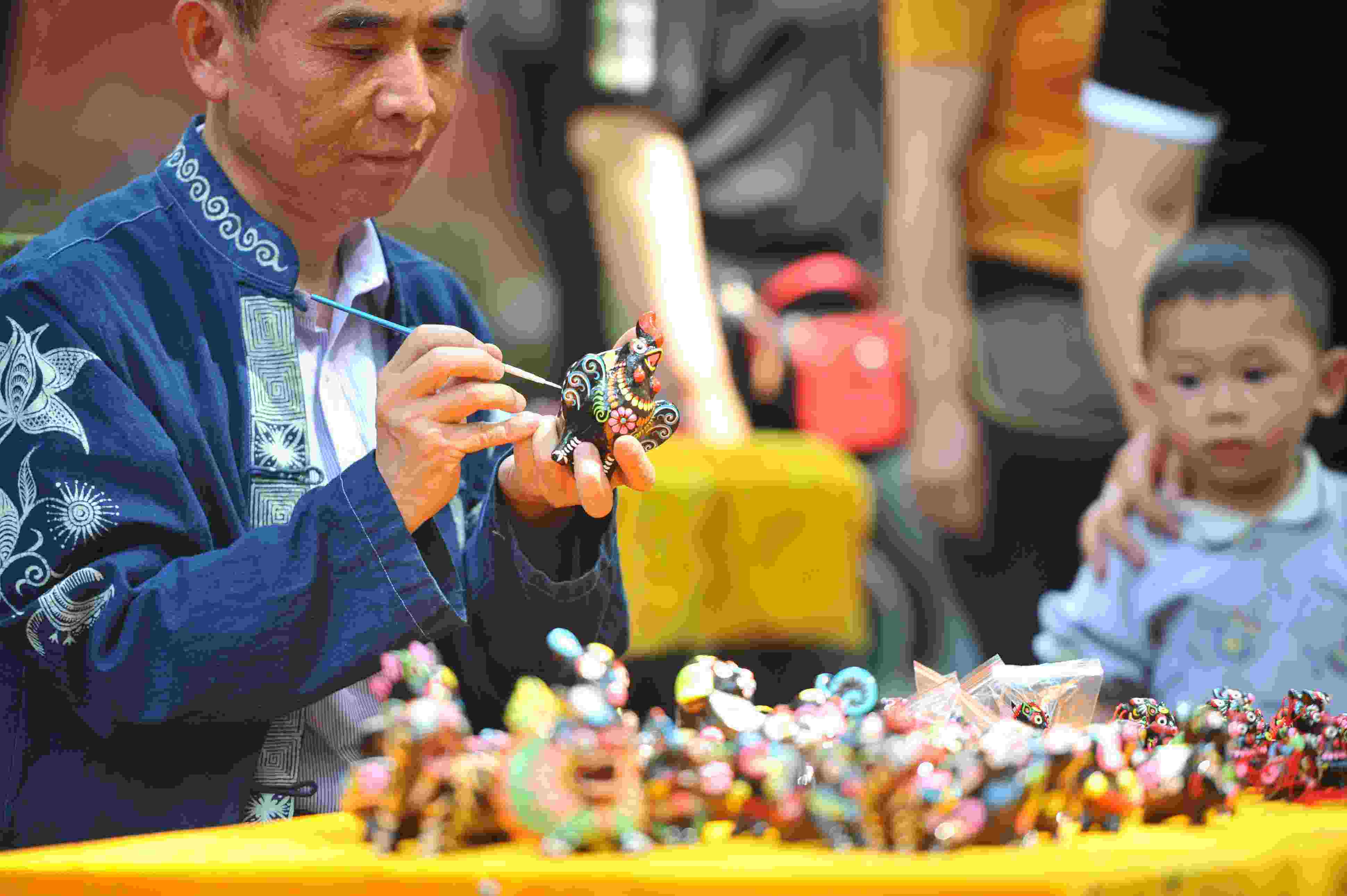 2023年5月26日,民間藝人在貴州省黃平縣飛云崖景區(qū)展示傳統(tǒng)泥哨技藝。 (寧堅 楊忠)