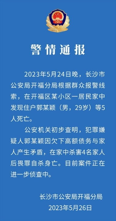 ·警方通報(bào)長(zhǎng)沙某小區(qū)房?jī)?nèi)發(fā)現(xiàn)5具尸體:男子殺害4名家人后畏罪自殺。