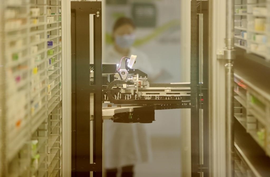 4月2日,浙江省德清縣第三人民醫(yī)院智慧藥房發(fā)藥機(jī)器人在配藥。新華社發(fā)(謝尚國攝)
