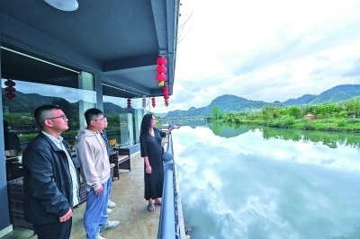 在浙江杭州臨安區(qū)昌化鎮(zhèn)白牛村,村落景區(qū)投資運營商羅星玥(右一)向游客介紹白牛村的自然風光。新華社發(fā)
