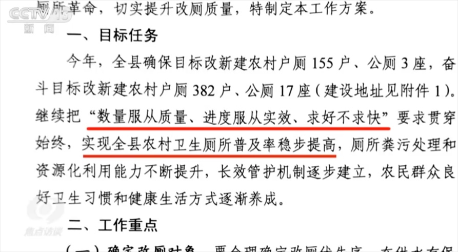 近年來,桂東縣持續(xù)加大廁改資金保障力度。政府切實投入了真金白銀,但在一些地方,廁改的成效卻打了水漂。記者拿到了《桂東縣2023年農村“廁所革命”工作方案》,文中提出,繼續(xù)把“數(shù)量服從質量、進度服從實效、求好不求快”要求貫穿始終,實現(xiàn)全縣農村衛(wèi)生廁所普及率穩(wěn)步提高。