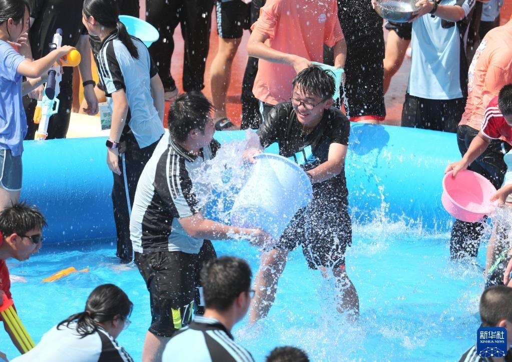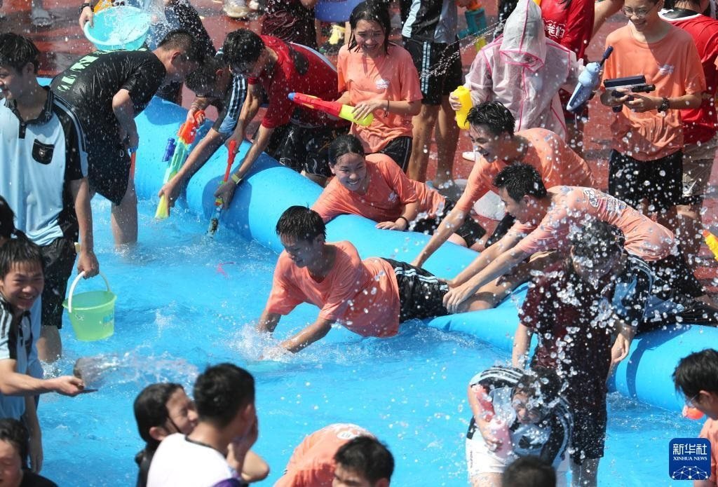 6月2日,學(xué)生們享受潑水活動帶來的快樂。