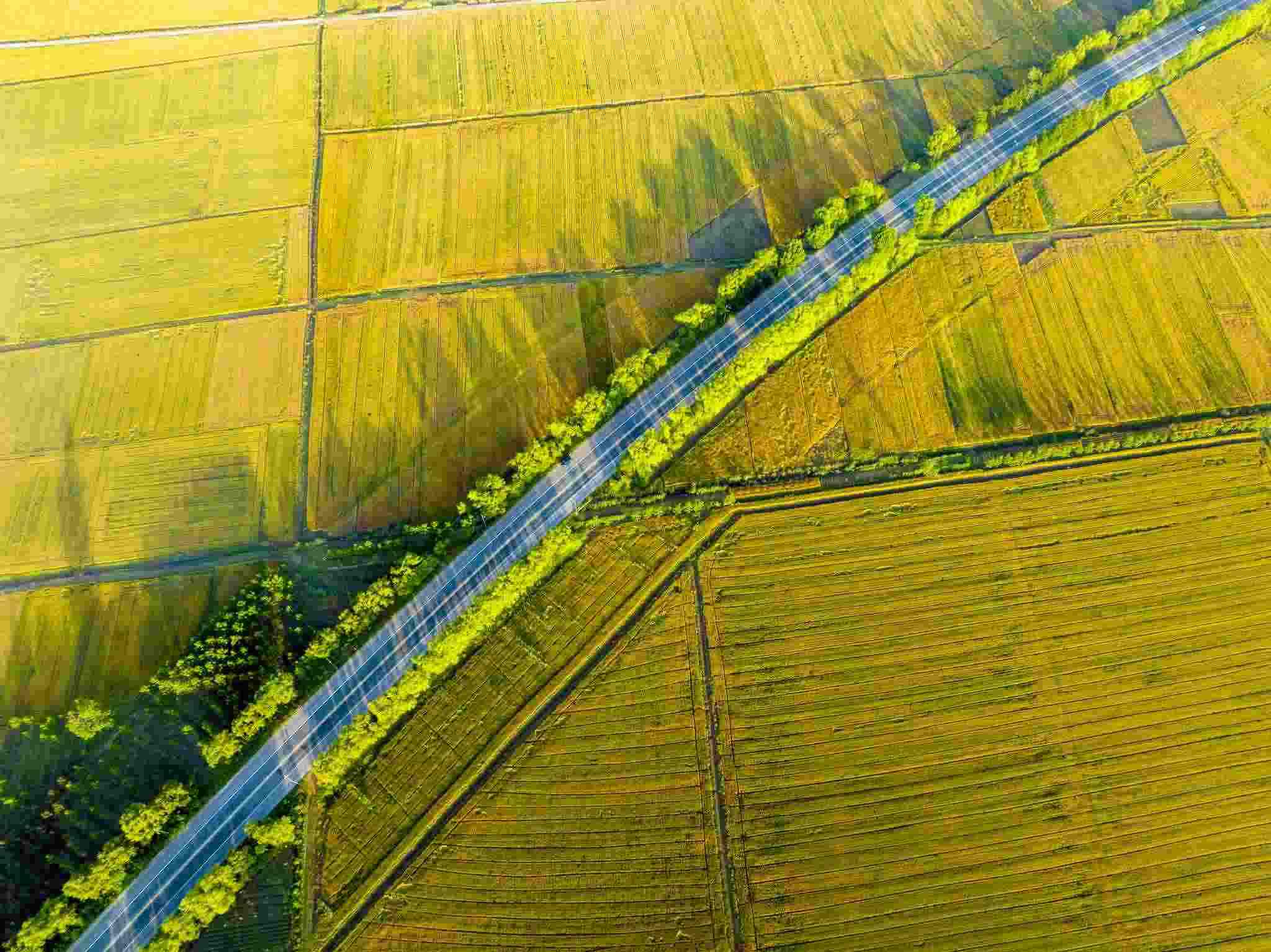 2023年6月3日,江蘇連云港,東??h,金色田野與村莊、道路、河流共同構(gòu)成了一幅秀美的夏日豐收畫卷。視覺中國