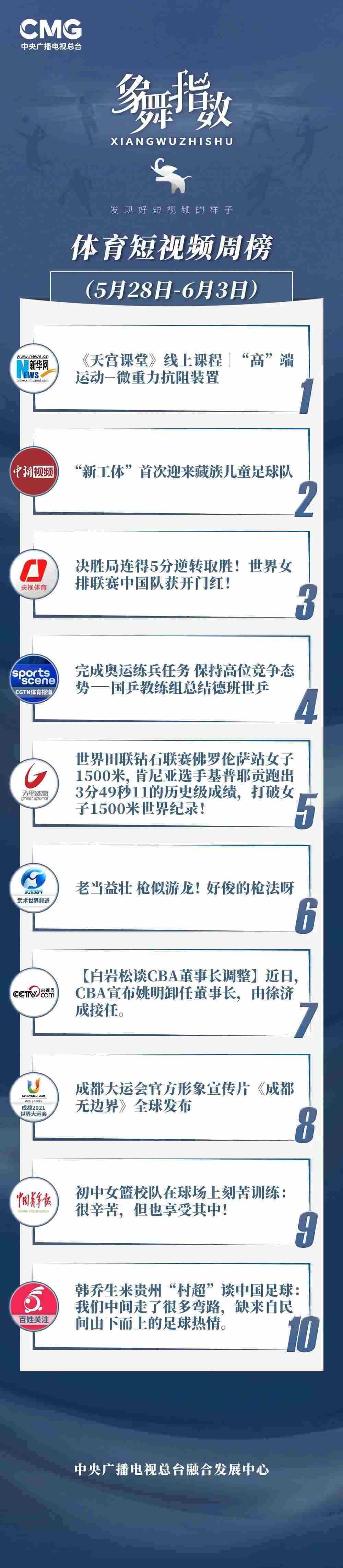 中央廣播電視總臺“象舞指數(shù)”評議品牌,推出體育短視頻周榜、總臺體育短視頻周榜。在5月28日—6月3日,以下內(nèi)容獲得矚目:
