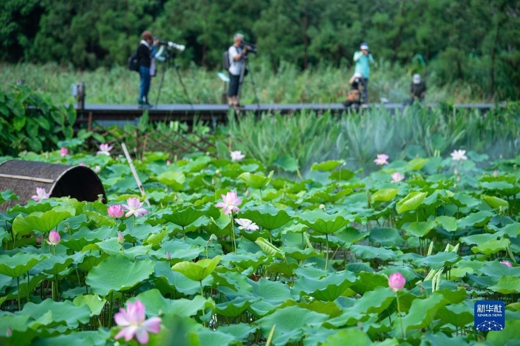 6月9日,人們?cè)诎拈T龍環(huán)葡韻拍攝荷花。