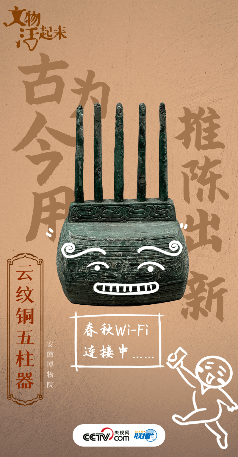 這件文物名為“云紋銅五柱器”,斷代為西周(公元前1046年-公元前771年),用途待考。早年有人認為它是樂器,該觀點很快被否定。后有人認為是某種器物的底座,亦是語焉不詳。還有人認為是古人祭祀祖先時插先祖牌位的底座,這種觀點也有待于學術界論證。