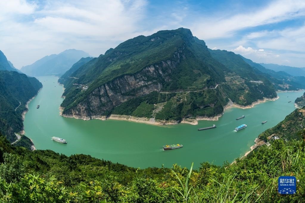 6月10日,船舶行駛在三峽大壩上游湖北省宜昌市秭歸縣水域。三峽水庫(kù)水位下降后的消落帶清晰可見(jiàn)。