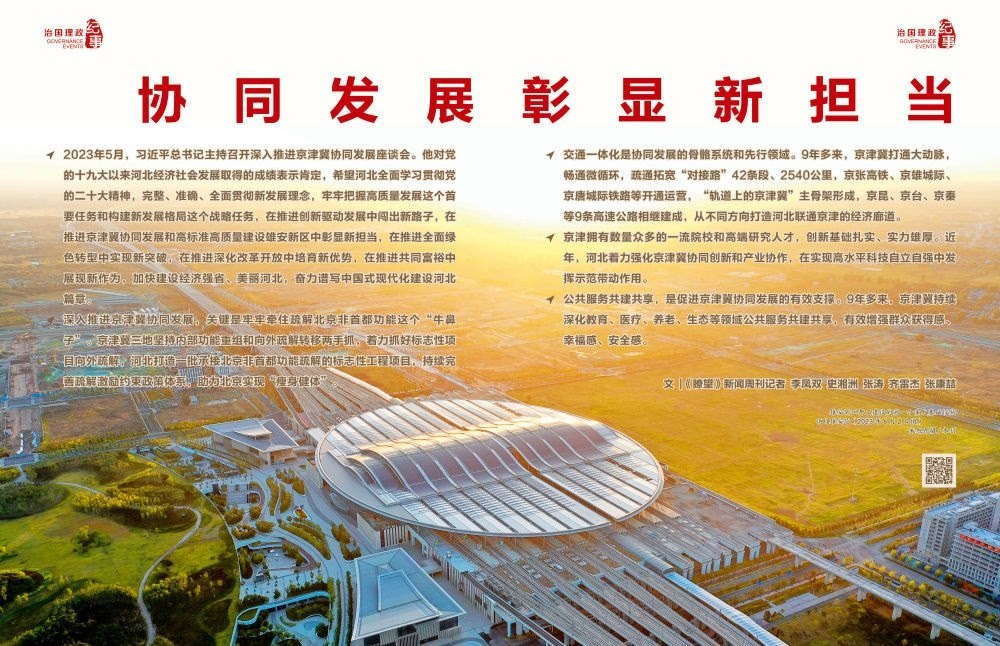 ◇2023年5月,習(xí)近平總書記主持召開深入推進京津冀協(xié)同發(fā)展座談會。他對黨的十九大以來河北經(jīng)濟社會發(fā)展取得的成績表示肯定,希望河北全面學(xué)習(xí)貫徹黨的二十大精神,完整、準確、全面貫徹新發(fā)展理念,牢牢把握高質(zhì)量發(fā)展這個首要任務(wù)和構(gòu)建新發(fā)展格局這個戰(zhàn)略任務(wù),在推進創(chuàng)新驅(qū)動發(fā)展中闖出新路子,在推進京津冀協(xié)同發(fā)展和高標準高質(zhì)量建設(shè)雄安新區(qū)中彰顯新?lián)?,在推進全面綠色轉(zhuǎn)型中實現(xiàn)新突破,在推進深化改革開放中培育新優(yōu)勢,在推進共同富裕中展現(xiàn)新作為,加快建設(shè)經(jīng)濟強省、美麗河北,奮力譜寫中國式現(xiàn)代化建設(shè)河北篇章。