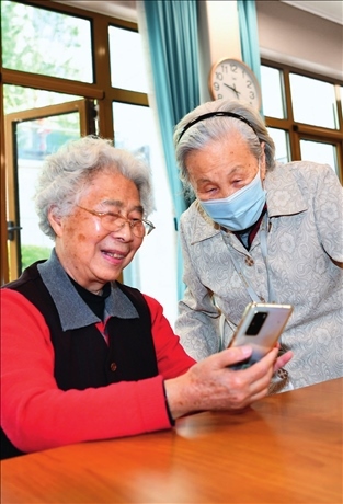 老人在位于河北三河的燕達金色年華健康養(yǎng)護中心老年活動室交談(2022年5月18日攝)朱旭東攝 / 本刊