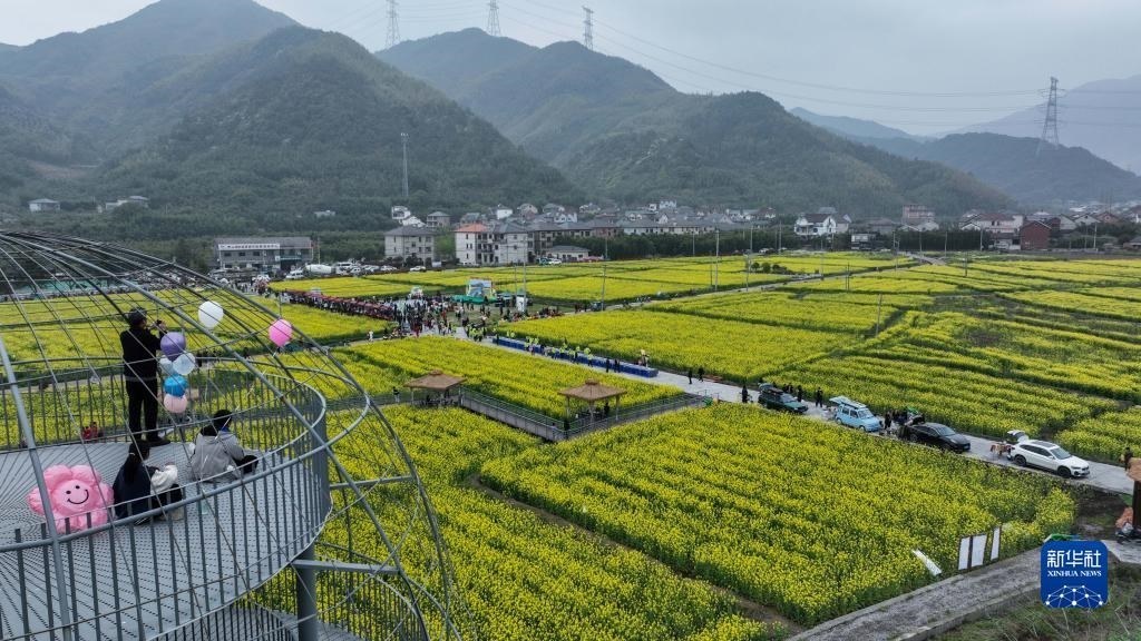 在浙江杭州臨安區(qū)青山湖街道郎家村“共富稻田”,游客乘坐田野小火車在油菜花地里感受春日美景(4月1日攝)?!肮哺坏咎铩倍ㄎ欢喙δ芴飯@農(nóng)旅綜合體,陸續(xù)打造了妙哉花園、稻田觀光道、稻田餐廳、稻田茶吧等鄉(xiāng)村旅游特色節(jié)點(diǎn),吸引城市居民前來(lái)體驗(yàn)戶外農(nóng)田生活。新華社記者 徐昱 攝