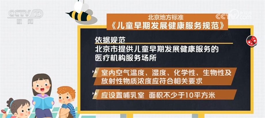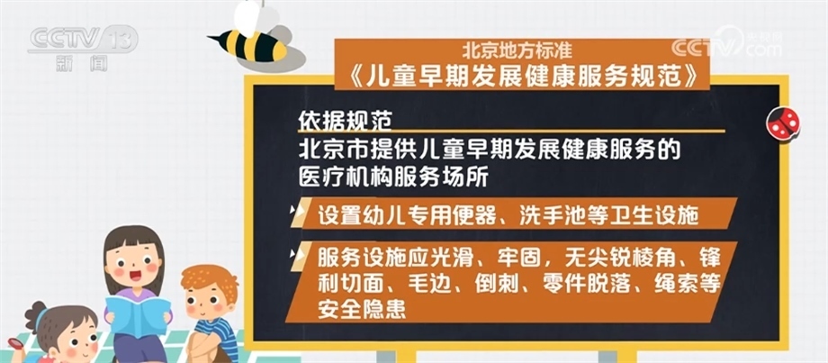 依據(jù)規(guī)范,北京市提供兒童早期發(fā)展健康服務(wù)的醫(yī)療機構(gòu)服務(wù)場所應(yīng)遠(yuǎn)離各種污染源,采光充足,通風(fēng)良好,遠(yuǎn)離噪聲與電磁干擾;設(shè)置防蚊、蟲、蠅、鼠等設(shè)備,并放置于兒童無法接觸到的地方;室內(nèi)空氣溫度、濕度、化學(xué)性、生物性及放射性物質(zhì)濃度應(yīng)符合相關(guān)要求。應(yīng)設(shè)置哺乳室,面積不少于10平方米;設(shè)置幼兒專用便器、洗手池等衛(wèi)生設(shè)施;服務(wù)設(shè)施應(yīng)光滑、牢固,無尖銳棱角、鋒利切面、毛邊、倒刺、零件脫落、繩索等安全隱患。