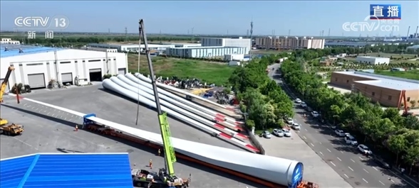 總臺(tái)央視記者 古峻嶺:我現(xiàn)在就在連云港生產(chǎn)超長(zhǎng)風(fēng)電葉片的這個(gè)廠區(qū)。我身后就是這場(chǎng)直播連線的主角——長(zhǎng)達(dá)123米的超長(zhǎng)海上風(fēng)電葉片,像這樣的葉片一共有3支,我們可以看到此刻它已經(jīng)完成了正式安裝前的所有檢測(cè)工作,剛剛吊裝到一輛65米長(zhǎng)的專(zhuān)用平板運(yùn)輸車(chē)上,即將開(kāi)啟陸地轉(zhuǎn)運(yùn)的第一步。