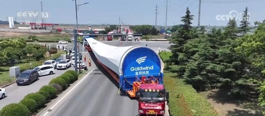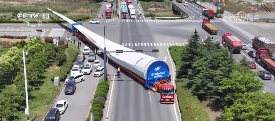 央視網(wǎng)消息:今天(6月14日)上午,100%我國自主知識(shí)產(chǎn)權(quán)的123米超長海上風(fēng)電葉片在江蘇連云港啟動(dòng)陸地轉(zhuǎn)運(yùn)工作。上午9時(shí),代表著我國風(fēng)電裝備最新技術(shù)水準(zhǔn)的大葉片,從廠區(qū)到港口碼頭,陸地運(yùn)輸全程約30公里,耗時(shí)約3到4個(gè)小時(shí),其中運(yùn)輸大葉片的車輛還要拐過90度的直角彎。如此大體量的裝備運(yùn)輸是一個(gè)復(fù)雜的過程,其中有哪些技術(shù)難點(diǎn)?來看記者今天上午從現(xiàn)場發(fā)回的報(bào)道。