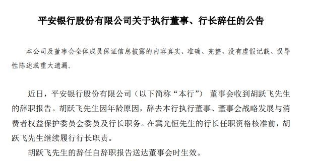 6月9日,平安銀行發(fā)布公告,原行長(zhǎng)胡躍飛辭職。這位已在平安工作了數(shù)十年的“老將”因年齡原因辭去該行執(zhí)行董事、董事會(huì)戰(zhàn)略發(fā)展與消費(fèi)者權(quán)益保護(hù)委員會(huì)委員及行長(zhǎng)職務(wù)。