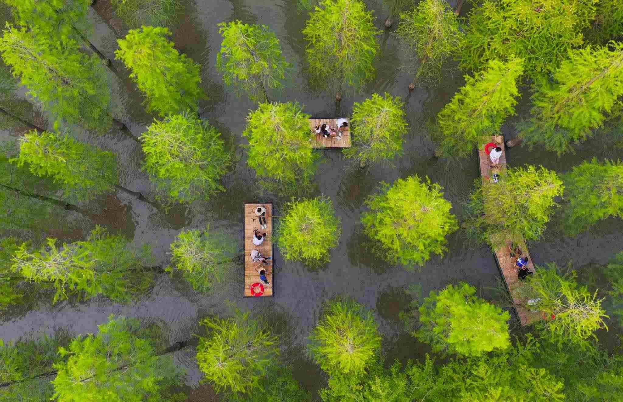 2023年6月16日,江蘇省宿遷市,泗洪縣洪澤湖濕地水杉林滿目蒼翠、郁郁蔥蔥,游客乘坐竹筏,在水杉林間穿梭游玩。視覺(jué)中國(guó)