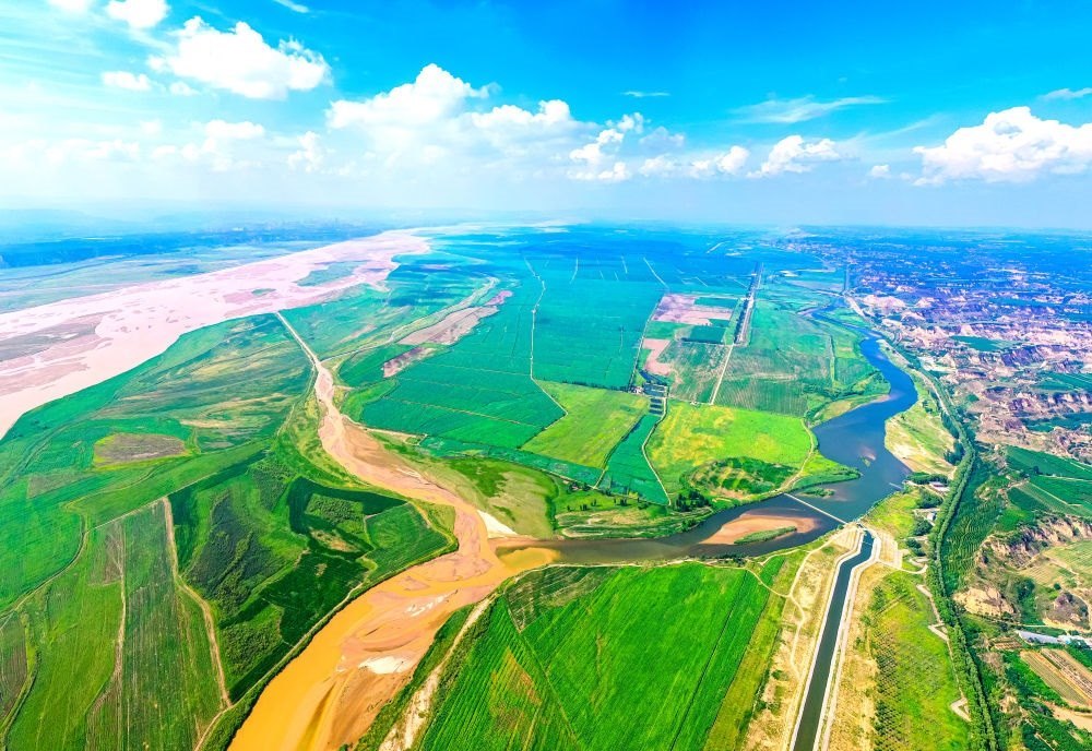 流經(jīng)寧夏青銅峽市境內(nèi)的黃河,滋潤著岸邊水稻和各種植被(無人機照片,5月25日攝)。新華社記者馮開華 攝