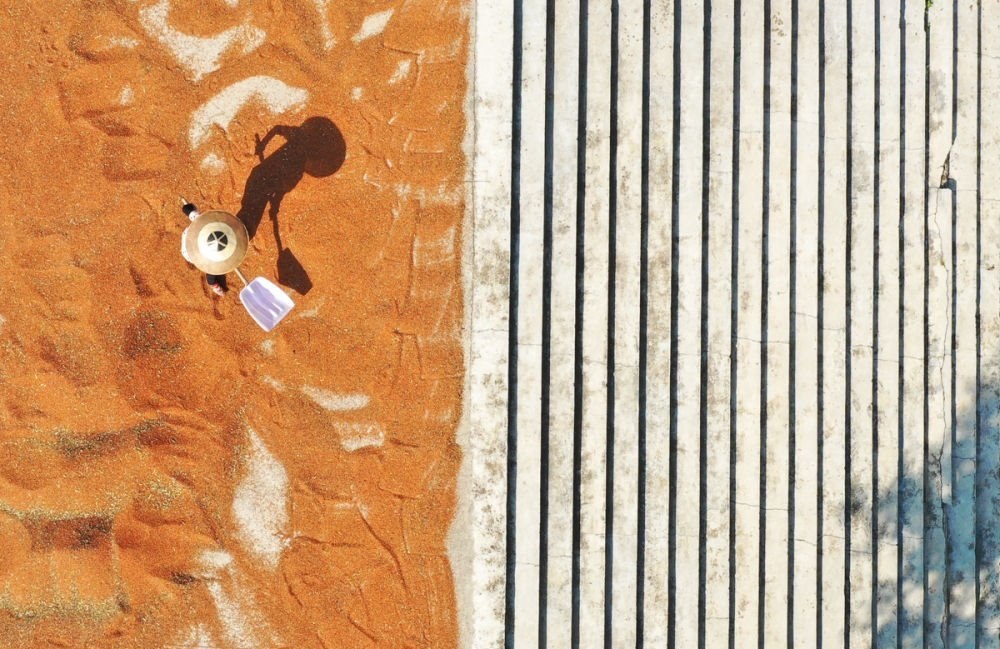 ↑2023年9月6日,湖南省張家界市武陵源區(qū)協(xié)合鄉(xiāng),農(nóng)民在晾曬稻谷。CICPHOTO/吳勇兵 攝