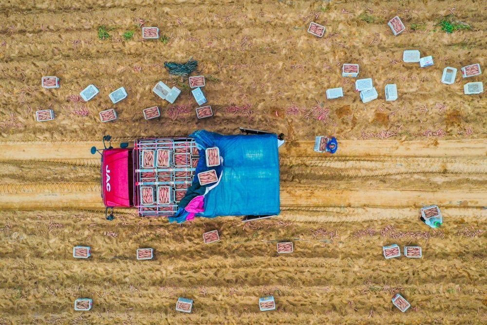 ↑2023年8月21日,河南省濮陽市清豐縣古城鄉(xiāng)齊家村,農(nóng)民在將采收的紅薯裝筐。CICPHOTO/紀全舉 攝