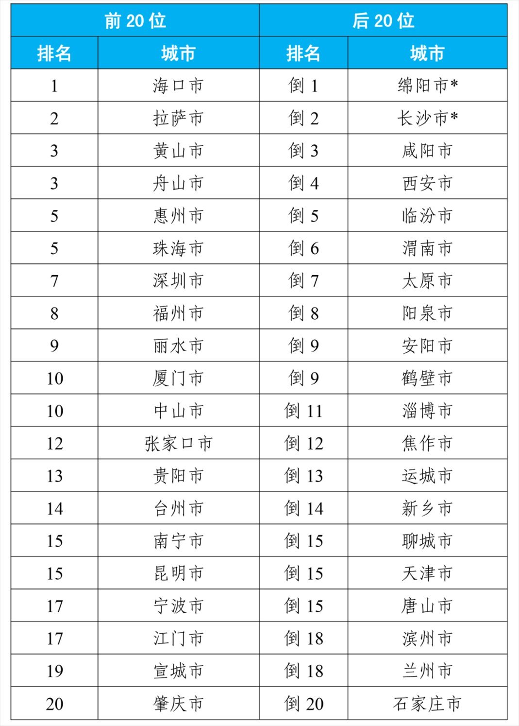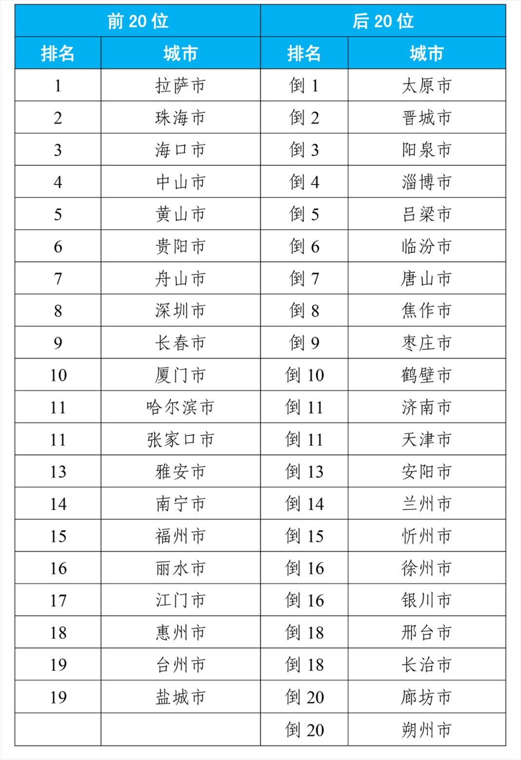 8月,168個重點(diǎn)城市中,空氣質(zhì)量排名前20位城市依次是拉薩、珠海和??诘瘸鞘校◤牡?名至并列第19名);空氣質(zhì)量排名后20位城市依次是太原、晉城和陽泉等城市(從倒數(shù)第1名至并列倒數(shù)第20名)。見附表1。