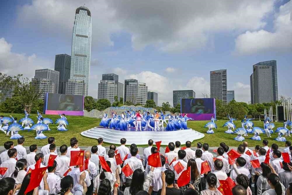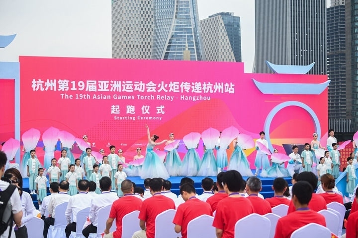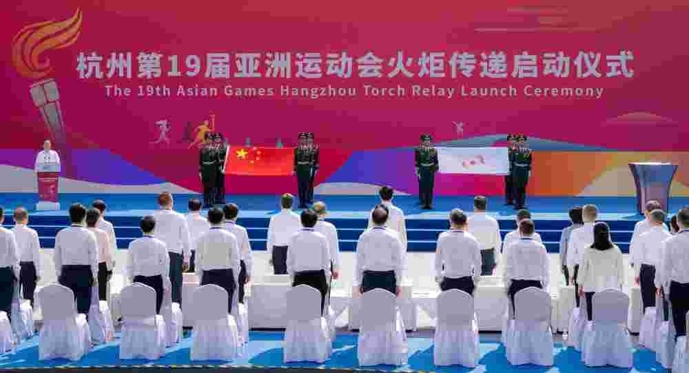 ↑這是杭州亞運(yùn)會(huì)火炬?zhèn)鬟f杭州站起跑儀式現(xiàn)場。