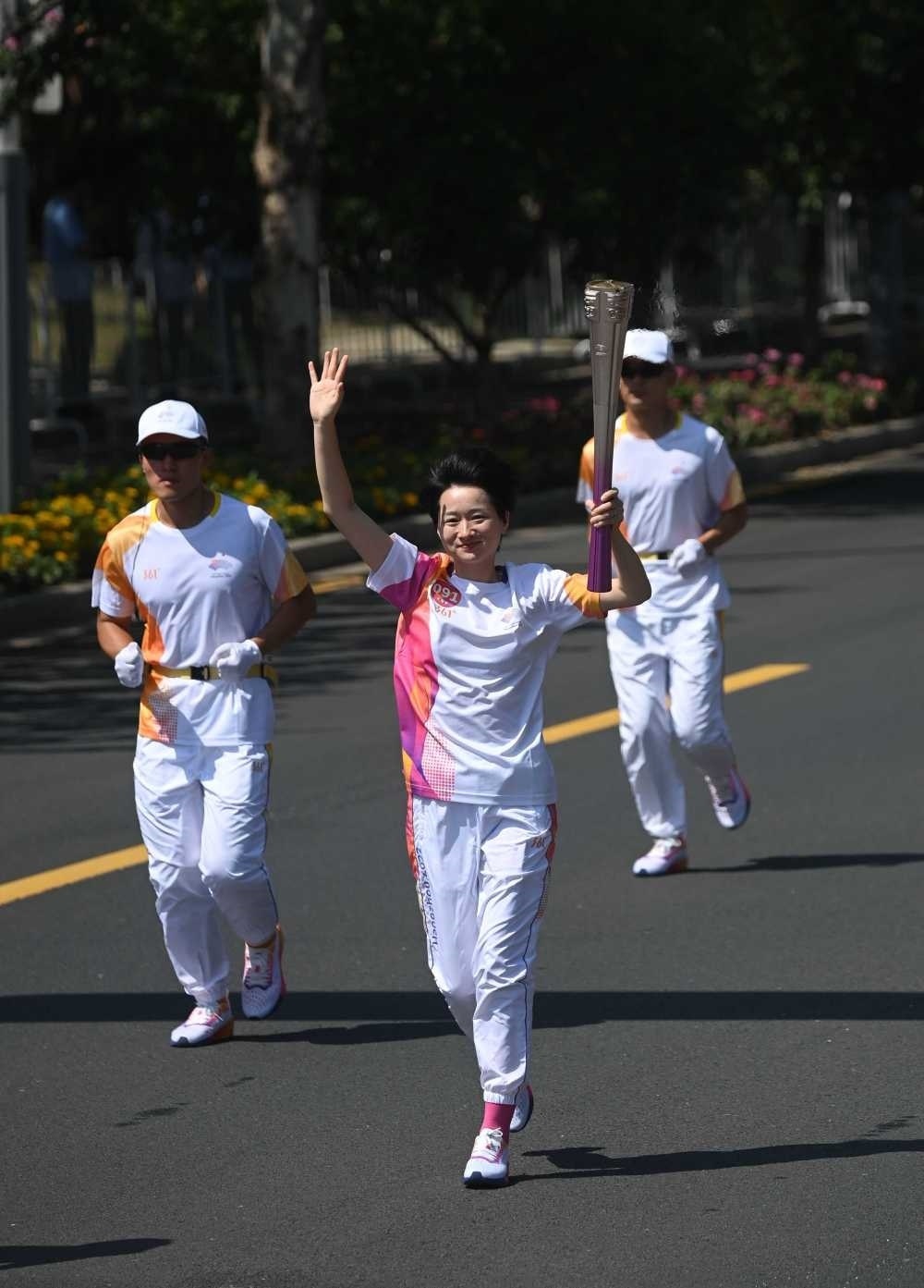 ↑火炬手司燁儀在火炬?zhèn)鬟f中。