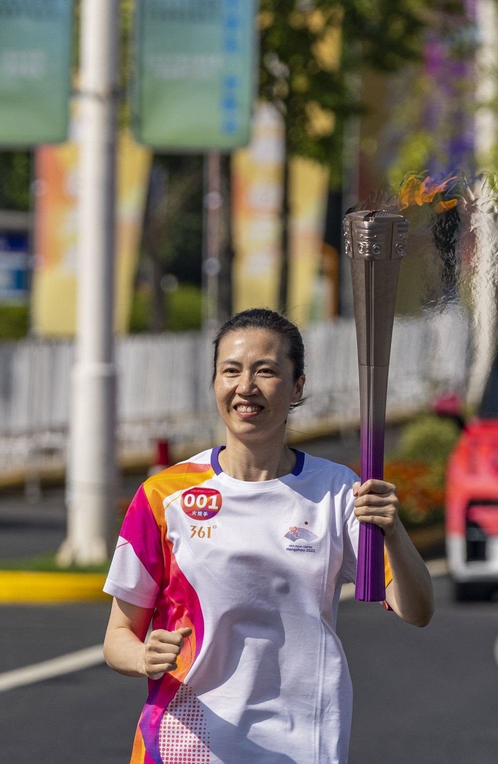 ↑火炬手羅瑜在火炬?zhèn)鬟f中。